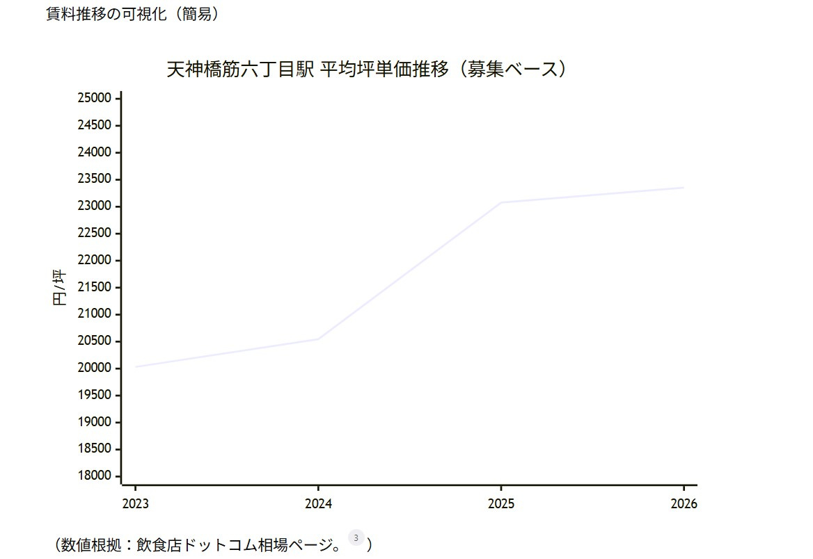 賃料相場は、飲食店向け物件DBを持つ飲食店ドットコムの「天神橋筋六丁目駅」相場が、直近1年平均で約2.33万円/坪、年別推移(募集ベース)で2023年:約2.00万円/坪 → 2026年:約2.34万円/坪と上昇基調です。