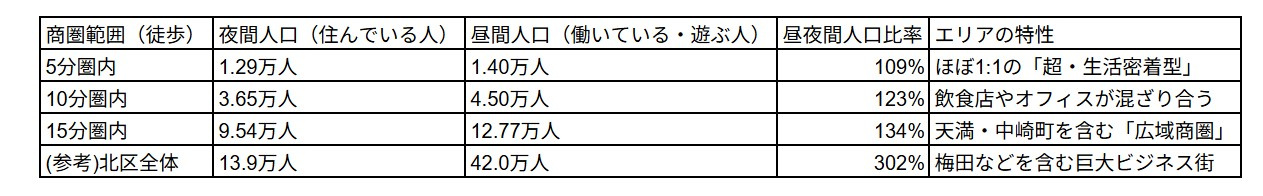 一方、天神橋六丁目周辺のリング簡易集計では、徒歩15分圏で北区夜間人口の約68%を含む推計になり、広域(天満・南森町・中崎町方面)まで実質商圏が拡張する可能性が高いことを示唆します。
