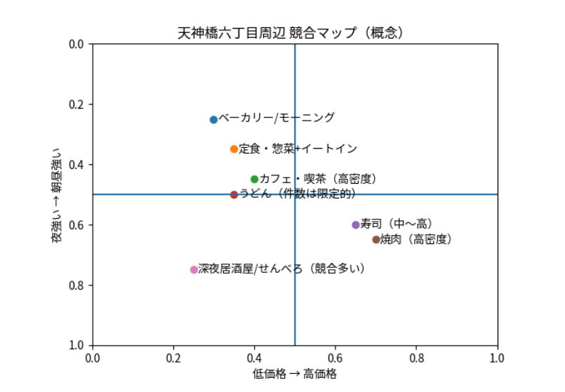 - 天神橋筋(商店街)側:回遊・比較購買が起きるため、テイクアウト・軽飲食・名物化が刺さる。
